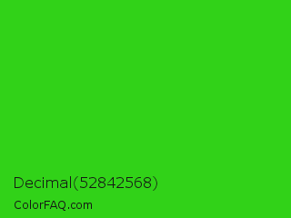 Decimal 52842568 Color is a normal green color and the nearest color is Harlequin Green #46cb18. Hex code #31d218 and RGB value is rgb(49,210,24). In RGB color space, this color is composed of 19% red, 82% green, 9% blue, In CMYK color space, this color is composed of 77% cyan, 0% magenta, 89% yellow , 18% black , In HSL color space, this color has a hue angle of 112° , 79% saturation and 46% lightness.