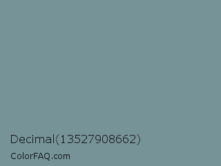 Decimal 13527908662 Color is a normal cyan color and the nearest color is Juniper #6d9292. Hex code #769398 and RGB value is rgb(118,147,152). In RGB color space, this color is composed of 46% red, 58% green, 60% blue, In CMYK color space, this color is composed of 22% cyan, 3% magenta, 0% yellow , 40% black , In HSL color space, this color has a hue angle of 189° , 14% saturation and 53% lightness.