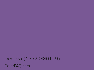 Decimal 13529880119 Color is a normal purple color and the nearest color is Dark Lavender #734f96. Hex code #795895 and RGB value is rgb(121,88,149). In RGB color space, this color is composed of 47% red, 35% green, 58% blue, In CMYK color space, this color is composed of 19% cyan, 41% magenta, 0% yellow , 42% black , In HSL color space, this color has a hue angle of 272° , 26% saturation and 46% lightness.