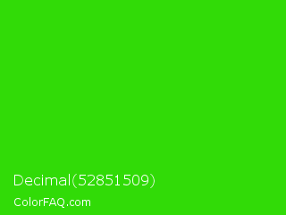 Decimal 52851509 Color is a normal green color and the nearest color is Harlequin Green #46cb18. Hex code #31db07 and RGB value is rgb(49,219,7). In RGB color space, this color is composed of 19% red, 86% green, 3% blue, In CMYK color space, this color is composed of 78% cyan, 0% magenta, 97% yellow , 14% black , In HSL color space, this color has a hue angle of 108° , 94% saturation and 44% lightness.