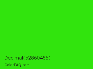 Decimal 52860485 Color is a normal green color and the nearest color is Neon Green #39ff14. Hex code #31e40d and RGB value is rgb(49,228,13). In RGB color space, this color is composed of 19% red, 89% green, 5% blue, In CMYK color space, this color is composed of 79% cyan, 0% magenta, 94% yellow , 11% black , In HSL color space, this color has a hue angle of 110° , 89% saturation and 47% lightness.