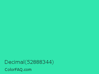 Decimal 52888344 Color is a normal green color and the nearest color is Eucalyptus #44d7a8. Hex code #31e6ae and RGB value is rgb(49,230,174). In RGB color space, this color is composed of 19% red, 90% green, 68% blue, In CMYK color space, this color is composed of 79% cyan, 0% magenta, 24% yellow , 10% black , In HSL color space, this color has a hue angle of 161° , 78% saturation and 55% lightness.