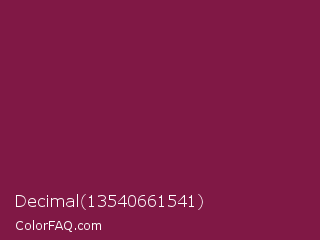 Decimal 13540661541 Color is a dark rose color and the nearest color is Pansy Purple #78184a. Hex code #801845 and RGB value is rgb(128,24,69). In RGB color space, this color is composed of 50% red, 9% green, 27% blue, In CMYK color space, this color is composed of 0% cyan, 81% magenta, 46% yellow , 50% black , In HSL color space, this color has a hue angle of 334° , 68% saturation and 30% lightness.