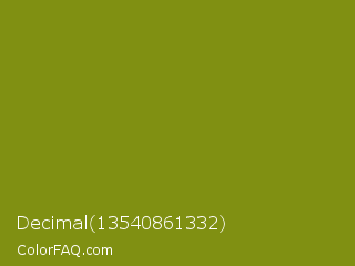 Decimal 13540861332 Color is a normal yellow color and the nearest color is Trendy Green #7c881a. Hex code #809012 and RGB value is rgb(128,144,18). In RGB color space, this color is composed of 50% red, 56% green, 7% blue, In CMYK color space, this color is composed of 11% cyan, 0% magenta, 88% yellow , 44% black , In HSL color space, this color has a hue angle of 68° , 78% saturation and 32% lightness.