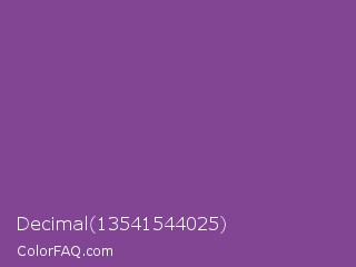 Decimal 13541544025 Color is a normal purple color and the nearest color is Vivid Violet #803790. Hex code #814593 and RGB value is rgb(129,69,147). In RGB color space, this color is composed of 51% red, 27% green, 58% blue, In CMYK color space, this color is composed of 12% cyan, 53% magenta, 0% yellow , 42% black , In HSL color space, this color has a hue angle of 286° , 36% saturation and 42% lightness.