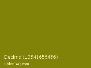 Decimal 13541656466 Color is a dark yellow color and the nearest color is Olive #808000. Hex code #818308 and RGB value is rgb(129,131,8). In RGB color space, this color is composed of 51% red, 51% green, 3% blue, In CMYK color space, this color is composed of 2% cyan, 0% magenta, 94% yellow , 49% black , In HSL color space, this color has a hue angle of 61° , 88% saturation and 27% lightness.
