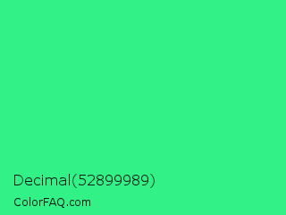Decimal 52899989 Color is a normal green color and the nearest color is Shamrock #33cc99. Hex code #31f187 and RGB value is rgb(49,241,135). In RGB color space, this color is composed of 19% red, 95% green, 53% blue, In CMYK color space, this color is composed of 80% cyan, 0% magenta, 44% yellow , 5% black , In HSL color space, this color has a hue angle of 147° , 87% saturation and 57% lightness.
