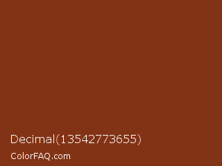 Decimal 13542773655 Color is a dark orange color and the nearest color is Kobe #882d17. Hex code #833315 and RGB value is rgb(131,51,21). In RGB color space, this color is composed of 51% red, 20% green, 8% blue, In CMYK color space, this color is composed of 0% cyan, 61% magenta, 84% yellow , 49% black , In HSL color space, this color has a hue angle of 16° , 72% saturation and 30% lightness.