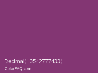 Decimal 13542777433 Color is a normal magenta color and the nearest color is Razzmic Berry Crayola #843179. Hex code #833673 and RGB value is rgb(131,54,115). In RGB color space, this color is composed of 51% red, 21% green, 45% blue, In CMYK color space, this color is composed of 0% cyan, 59% magenta, 12% yellow , 49% black , In HSL color space, this color has a hue angle of 312° , 42% saturation and 36% lightness.