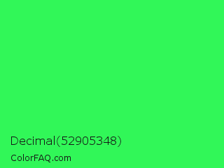 Decimal 52905348 Color is a normal green color and the nearest color is UFO Green #3cd070. Hex code #31f758 and RGB value is rgb(49,247,88). In RGB color space, this color is composed of 19% red, 97% green, 35% blue, In CMYK color space, this color is composed of 80% cyan, 0% magenta, 64% yellow , 3% black , In HSL color space, this color has a hue angle of 132° , 93% saturation and 58% lightness.