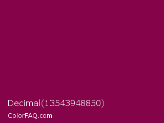 Decimal 13543948850 Color is a dark rose color and the nearest color is Rose Bud Cherry #800b47. Hex code #850348 and RGB value is rgb(133,3,72). In RGB color space, this color is composed of 52% red, 1% green, 28% blue, In CMYK color space, this color is composed of 0% cyan, 98% magenta, 46% yellow , 48% black , In HSL color space, this color has a hue angle of 328° , 96% saturation and 27% lightness.