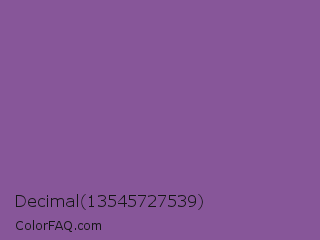 Decimal 13545727539 Color is a normal purple color and the nearest color is French Lilac #86608e. Hex code #875699 and RGB value is rgb(135,86,153). In RGB color space, this color is composed of 53% red, 34% green, 60% blue, In CMYK color space, this color is composed of 12% cyan, 44% magenta, 0% yellow , 40% black , In HSL color space, this color has a hue angle of 284° , 28% saturation and 47% lightness.