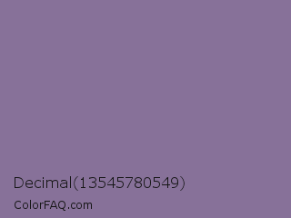 Decimal 13545780549 Color is a normal purple color and the nearest color is Trendy Pink #8c6495. Hex code #877199 and RGB value is rgb(135,113,153). In RGB color space, this color is composed of 53% red, 44% green, 60% blue, In CMYK color space, this color is composed of 12% cyan, 26% magenta, 0% yellow , 40% black , In HSL color space, this color has a hue angle of 273° , 16% saturation and 52% lightness.