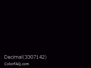 Decimal 3307142 Color is a almost black purple color and the nearest color is Rich Black FOGRA39 #010203. Hex code #050006 and RGB value is rgb(5,0,6). In RGB color space, this color is composed of 2% red, 0% green, 2% blue, In CMYK color space, this color is composed of 17% cyan, 100% magenta, 0% yellow , 98% black , In HSL color space, this color has a hue angle of 290° , 100% saturation and 1% lightness.