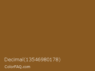 Decimal 13546980178 Color is a normal orange color and the nearest color is Grizzly #885818. Hex code #895920 and RGB value is rgb(137,89,32). In RGB color space, this color is composed of 54% red, 35% green, 13% blue, In CMYK color space, this color is composed of 0% cyan, 35% magenta, 77% yellow , 46% black , In HSL color space, this color has a hue angle of 33° , 62% saturation and 33% lightness.