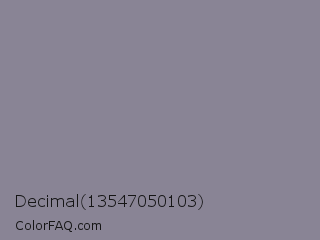Decimal 13547050103 Color is a normal indigo color and the nearest color is Mamba #8e8190. Hex code #898495 and RGB value is rgb(137,132,149). In RGB color space, this color is composed of 54% red, 52% green, 58% blue, In CMYK color space, this color is composed of 8% cyan, 11% magenta, 0% yellow , 42% black , In HSL color space, this color has a hue angle of 258° , 7% saturation and 55% lightness.