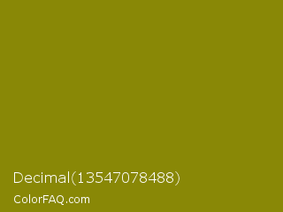 Decimal 13547078488 Color is a dark yellow color and the nearest color is Olive #808000. Hex code #898806 and RGB value is rgb(137,136,6). In RGB color space, this color is composed of 54% red, 53% green, 2% blue, In CMYK color space, this color is composed of 0% cyan, 1% magenta, 96% yellow , 46% black , In HSL color space, this color has a hue angle of 60° , 92% saturation and 28% lightness.