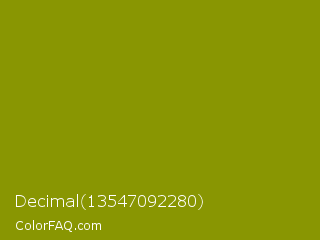 Decimal 13547092280 Color is a dark yellow color and the nearest color is Olive #808000. Hex code #899602 and RGB value is rgb(137,150,2). In RGB color space, this color is composed of 54% red, 59% green, 1% blue, In CMYK color space, this color is composed of 9% cyan, 0% magenta, 99% yellow , 41% black , In HSL color space, this color has a hue angle of 65° , 97% saturation and 30% lightness.