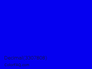 Decimal 3307808 Color is a normal indigo color and the nearest color is Blue #0000ff. Hex code #0500f0 and RGB value is rgb(5,0,240). In RGB color space, this color is composed of 2% red, 0% green, 94% blue, In CMYK color space, this color is composed of 98% cyan, 100% magenta, 0% yellow , 6% black , In HSL color space, this color has a hue angle of 241° , 100% saturation and 47% lightness.