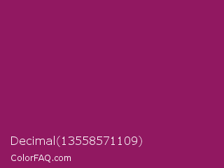 Decimal 13558571109 Color is a normal magenta color and the nearest color is Cardinal Pink #8c055e. Hex code #911861 and RGB value is rgb(145,24,97). In RGB color space, this color is composed of 57% red, 9% green, 38% blue, In CMYK color space, this color is composed of 0% cyan, 83% magenta, 33% yellow , 43% black , In HSL color space, this color has a hue angle of 324° , 72% saturation and 33% lightness.