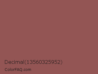 Decimal 13560325952 Color is a normal red color and the nearest color is Rose Taupe #905d5d. Hex code #935554 and RGB value is rgb(147,85,84). In RGB color space, this color is composed of 58% red, 33% green, 33% blue, In CMYK color space, this color is composed of 0% cyan, 42% magenta, 43% yellow , 42% black , In HSL color space, this color has a hue angle of 1° , 27% saturation and 45% lightness.