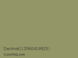 Decimal 13560419925 Color is a normal yellow color and the nearest color is Avocado Pulp #888d65. Hex code #939767 and RGB value is rgb(147,151,103). In RGB color space, this color is composed of 58% red, 59% green, 40% blue, In CMYK color space, this color is composed of 3% cyan, 0% magenta, 32% yellow , 41% black , In HSL color space, this color has a hue angle of 65° , 19% saturation and 50% lightness.