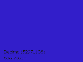 Decimal 52971138 Color is a normal indigo color and the nearest color is Interdimensional Blue #360ccc. Hex code #321eca and RGB value is rgb(50,30,202). In RGB color space, this color is composed of 20% red, 12% green, 79% blue, In CMYK color space, this color is composed of 75% cyan, 85% magenta, 0% yellow , 21% black , In HSL color space, this color has a hue angle of 247° , 74% saturation and 45% lightness.