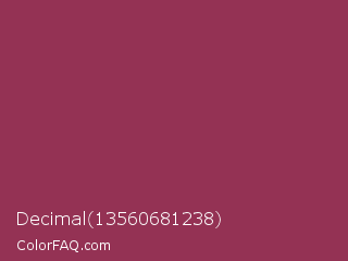 Decimal 13560681238 Color is a normal rose color and the nearest color is Quinacridone Magenta #8e3a59. Hex code #943254 and RGB value is rgb(148,50,84). In RGB color space, this color is composed of 58% red, 20% green, 33% blue, In CMYK color space, this color is composed of 0% cyan, 66% magenta, 43% yellow , 42% black , In HSL color space, this color has a hue angle of 339° , 49% saturation and 39% lightness.