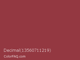 Decimal 13560711219 Color is a normal red color and the nearest color is Smoky Topaz #933d41. Hex code #943841 and RGB value is rgb(148,56,65). In RGB color space, this color is composed of 58% red, 22% green, 25% blue, In CMYK color space, this color is composed of 0% cyan, 62% magenta, 56% yellow , 42% black , In HSL color space, this color has a hue angle of 354° , 45% saturation and 40% lightness.