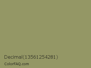 Decimal 13561254281 Color is a normal yellow color and the nearest color is Moss Green #8a9a5b. Hex code #949765 and RGB value is rgb(148,151,101). In RGB color space, this color is composed of 58% red, 59% green, 40% blue, In CMYK color space, this color is composed of 2% cyan, 0% magenta, 33% yellow , 41% black , In HSL color space, this color has a hue angle of 64° , 20% saturation and 49% lightness.