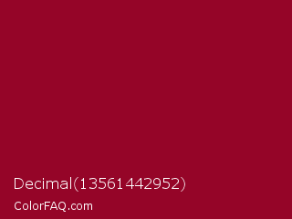Decimal 13561442952 Color is a dark red color and the nearest color is Paprika #8d0226. Hex code #950528 and RGB value is rgb(149,5,40). In RGB color space, this color is composed of 58% red, 2% green, 16% blue, In CMYK color space, this color is composed of 0% cyan, 97% magenta, 73% yellow , 42% black , In HSL color space, this color has a hue angle of 345° , 94% saturation and 30% lightness.
