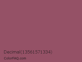 Decimal 13561571334 Color is a normal rose color and the nearest color is Twilight Lavender #8a496b. Hex code #955166 and RGB value is rgb(149,81,102). In RGB color space, this color is composed of 58% red, 32% green, 40% blue, In CMYK color space, this color is composed of 0% cyan, 46% magenta, 32% yellow , 42% black , In HSL color space, this color has a hue angle of 341° , 30% saturation and 45% lightness.