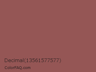 Decimal 13561577577 Color is a normal red color and the nearest color is Rose Taupe #905d5d. Hex code #955655 and RGB value is rgb(149,86,85). In RGB color space, this color is composed of 58% red, 34% green, 33% blue, In CMYK color space, this color is composed of 0% cyan, 42% magenta, 43% yellow , 42% black , In HSL color space, this color has a hue angle of 1° , 27% saturation and 46% lightness.