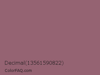 Decimal 13561590822 Color is a normal rose color and the nearest color is Mauve Taupe #915f6d. Hex code #956372 and RGB value is rgb(149,99,114). In RGB color space, this color is composed of 58% red, 39% green, 45% blue, In CMYK color space, this color is composed of 0% cyan, 34% magenta, 23% yellow , 42% black , In HSL color space, this color has a hue angle of 342° , 20% saturation and 49% lightness.