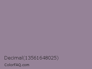 Decimal 13561648025 Color is a normal magenta color and the nearest color is Venus #928590. Hex code #958297 and RGB value is rgb(149,130,151). In RGB color space, this color is composed of 58% red, 51% green, 59% blue, In CMYK color space, this color is composed of 1% cyan, 14% magenta, 0% yellow , 41% black , In HSL color space, this color has a hue angle of 294° , 9% saturation and 55% lightness.