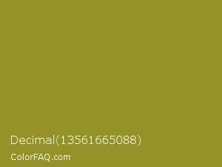 Decimal 13561665088 Color is a normal yellow color and the nearest color is Sycamore #908d39. Hex code #959328 and RGB value is rgb(149,147,40). In RGB color space, this color is composed of 58% red, 58% green, 16% blue, In CMYK color space, this color is composed of 0% cyan, 1% magenta, 73% yellow , 42% black , In HSL color space, this color has a hue angle of 59° , 58% saturation and 37% lightness.