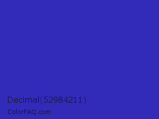 Decimal 52984211 Color is a normal indigo color and the nearest color is Governor Bay #2f3cb3. Hex code #322bb9 and RGB value is rgb(50,43,185). In RGB color space, this color is composed of 20% red, 17% green, 73% blue, In CMYK color space, this color is composed of 73% cyan, 77% magenta, 0% yellow , 27% black , In HSL color space, this color has a hue angle of 243° , 62% saturation and 45% lightness.