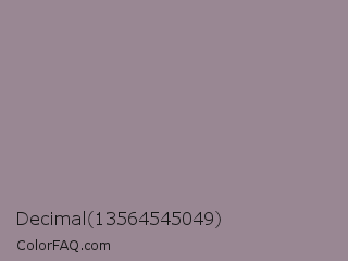 Decimal 13564545049 Color is a normal magenta color and the nearest color is Venus #928590. Hex code #998793 and RGB value is rgb(153,135,147). In RGB color space, this color is composed of 60% red, 53% green, 58% blue, In CMYK color space, this color is composed of 0% cyan, 12% magenta, 4% yellow , 40% black , In HSL color space, this color has a hue angle of 320° , 8% saturation and 56% lightness.