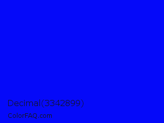 Decimal 3342899 Color is a normal blue color and the nearest color is Blue #0000ff. Hex code #0509f9 and RGB value is rgb(5,9,249). In RGB color space, this color is composed of 2% red, 4% green, 98% blue, In CMYK color space, this color is composed of 98% cyan, 96% magenta, 0% yellow , 2% black , In HSL color space, this color has a hue angle of 239° , 96% saturation and 50% lightness.