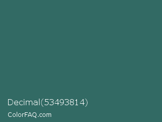 Decimal 53493814 Color is a normal cyan color and the nearest color is Casal #2f6168. Hex code #326a64 and RGB value is rgb(50,106,100). In RGB color space, this color is composed of 20% red, 42% green, 39% blue, In CMYK color space, this color is composed of 53% cyan, 0% magenta, 6% yellow , 58% black , In HSL color space, this color has a hue angle of 174° , 36% saturation and 31% lightness.