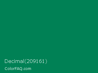 Decimal 209161 Color is a dark green color and the nearest color is Spanish Viridian #007f5c. Hex code #008155 and RGB value is rgb(0,129,85). In RGB color space, this color is composed of 0% red, 51% green, 33% blue, In CMYK color space, this color is composed of 100% cyan, 0% magenta, 34% yellow , 49% black , In HSL color space, this color has a hue angle of 160° , 100% saturation and 25% lightness.
