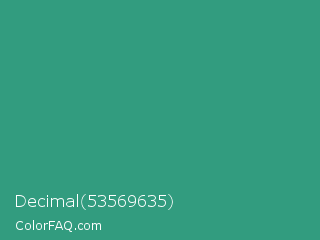 Decimal 53569635 Color is a normal cyan color and the nearest color is Illuminating Emerald #319177. Hex code #329c7f and RGB value is rgb(50,156,127). In RGB color space, this color is composed of 20% red, 61% green, 50% blue, In CMYK color space, this color is composed of 68% cyan, 0% magenta, 19% yellow , 39% black , In HSL color space, this color has a hue angle of 164° , 51% saturation and 40% lightness.