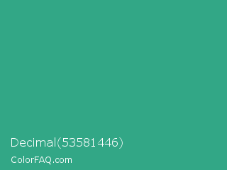 Decimal 53581446 Color is a normal green color and the nearest color is Jungle Green #29ab87. Hex code #32a786 and RGB value is rgb(50,167,134). In RGB color space, this color is composed of 20% red, 65% green, 53% blue, In CMYK color space, this color is composed of 70% cyan, 0% magenta, 20% yellow , 35% black , In HSL color space, this color has a hue angle of 163° , 54% saturation and 43% lightness.