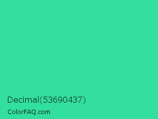 Decimal 53690437 Color is a normal green color and the nearest color is Shamrock #33cc99. Hex code #32df9d and RGB value is rgb(50,223,157). In RGB color space, this color is composed of 20% red, 87% green, 62% blue, In CMYK color space, this color is composed of 78% cyan, 0% magenta, 30% yellow , 13% black , In HSL color space, this color has a hue angle of 157° , 73% saturation and 54% lightness.