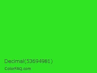 Decimal 53694981 Color is a normal green color and the nearest color is Lime Green #32cd32. Hex code #32e425 and RGB value is rgb(50,228,37). In RGB color space, this color is composed of 20% red, 89% green, 15% blue, In CMYK color space, this color is composed of 78% cyan, 0% magenta, 84% yellow , 11% black , In HSL color space, this color has a hue angle of 116° , 78% saturation and 52% lightness.