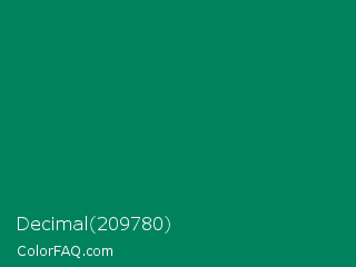 Decimal 209780 Color is a dark green color and the nearest color is Spanish Viridian #007f5c. Hex code #00825e and RGB value is rgb(0,130,94). In RGB color space, this color is composed of 0% red, 51% green, 37% blue, In CMYK color space, this color is composed of 100% cyan, 0% magenta, 28% yellow , 49% black , In HSL color space, this color has a hue angle of 163° , 100% saturation and 25% lightness.