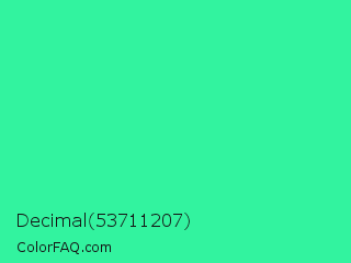 Decimal 53711207 Color is a normal green color and the nearest color is Eucalyptus #44d7a8. Hex code #32f39f and RGB value is rgb(50,243,159). In RGB color space, this color is composed of 20% red, 95% green, 62% blue, In CMYK color space, this color is composed of 79% cyan, 0% magenta, 35% yellow , 5% black , In HSL color space, this color has a hue angle of 154° , 89% saturation and 57% lightness.