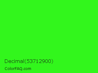 Decimal 53712900 Color is a normal green color and the nearest color is Neon Green #39ff14. Hex code #32f61c and RGB value is rgb(50,246,28). In RGB color space, this color is composed of 20% red, 96% green, 11% blue, In CMYK color space, this color is composed of 80% cyan, 0% magenta, 89% yellow , 4% black , In HSL color space, this color has a hue angle of 114° , 92% saturation and 54% lightness.