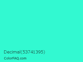 Decimal 53741395 Color is a normal cyan color and the nearest color is Turquoise #40e0d0. Hex code #32f9d1 and RGB value is rgb(50,249,209). In RGB color space, this color is composed of 20% red, 98% green, 82% blue, In CMYK color space, this color is composed of 80% cyan, 0% magenta, 16% yellow , 2% black , In HSL color space, this color has a hue angle of 168° , 94% saturation and 59% lightness.