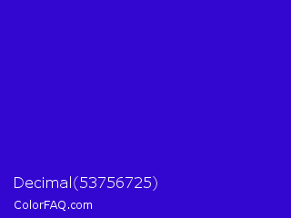 Decimal 53756725 Color is a normal indigo color and the nearest color is Interdimensional Blue #360ccc. Hex code #3307cf and RGB value is rgb(51,7,207). In RGB color space, this color is composed of 20% red, 3% green, 81% blue, In CMYK color space, this color is composed of 75% cyan, 97% magenta, 0% yellow , 19% black , In HSL color space, this color has a hue angle of 253° , 93% saturation and 42% lightness.
